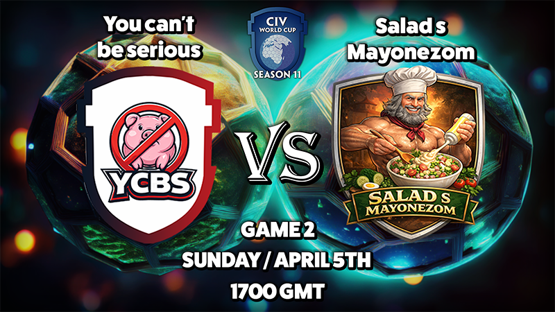 You can’t be serious vs Salad s Mayonezom – Group stage 1 – CWC Season 11 – Game 2 Spread the word! YCBS vs SaladPreviewENGLISH COMMENTARY Details League Season Full Time Civilization World Cup 2026-1 0' YCBS AdamTheEngineerdCousin SkeeterczozpElaphantguysahchickenudied4science Salad ValanchikAlfasometsIbraKarkarikMazini GoosiniV1r5162Dd0sBezdomniyYugo